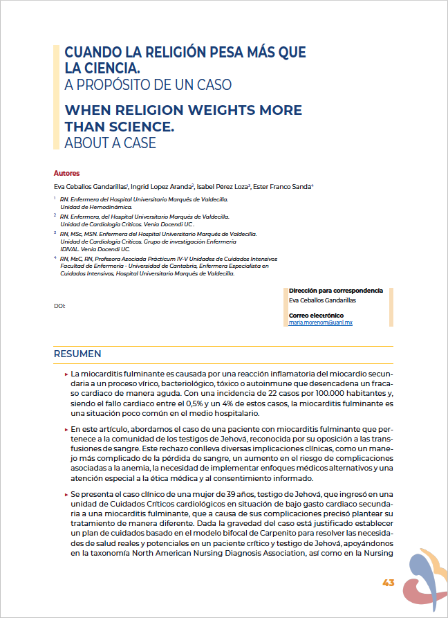 En este número también encontraremos 3 casos clínicos de gran interés. Estos son, “Plan de cuidados individualizados de enfermería a un paciente con shock cardiogénico” de José Martín Castro-Mata, “Cuando la religión pesa más que la ciencia. A propósito de un caso” de Eva Ceballos Gandarillas, y por último, Lucía Beltrán Folch nos presenta “Cuidados de enfermería en paciente con shock cardiogénico portador de Impella CP i membrana de oxigenación extracorpórea veno-arterial (ECMO V-A). A propósito de un caso“.