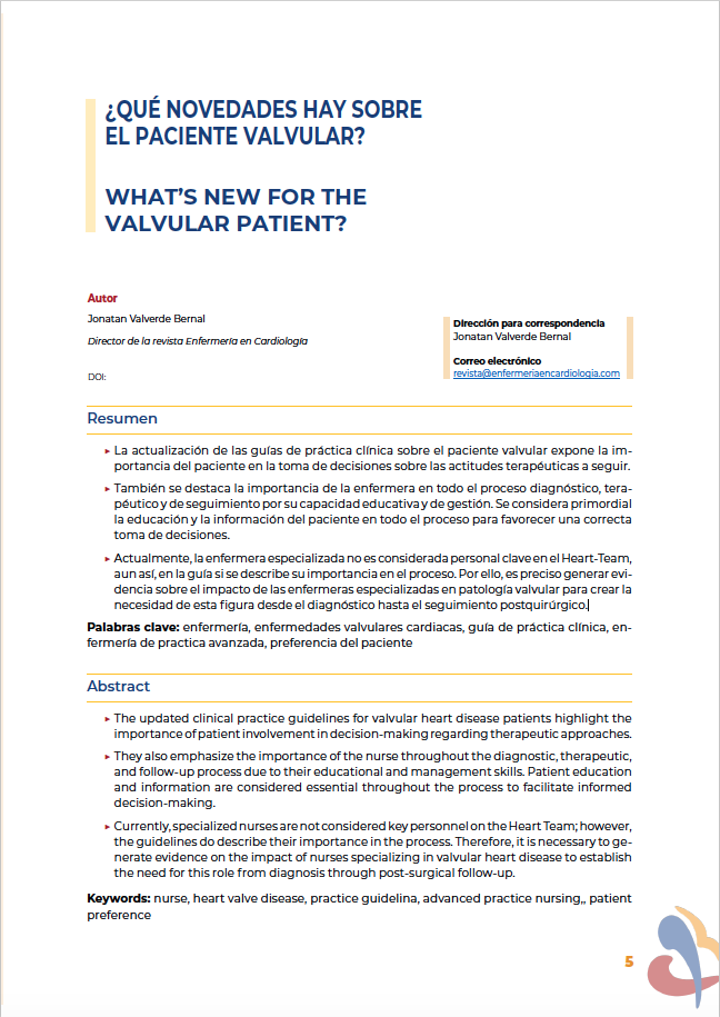 Para iniciar este número, os ofrecemos, dentro de la sección “Cardiac Nursing Today” un artículo de interés realizado por Jonatan Valverde Bernal sobre las novedades del paciente con patología valvular. En él, se pretende iniciar una serie de artículos sobre diferentes patologías con las novedades recientes de interés para el personal de enfermería A continuación, podremos encontrar el artículo original titulado “Factores asociados a la asistencia de pacientes en sesiones formativas en insuficiencia cardíaca: estudio observacional”, en el cual Concepción Cruzado Álvarez nos expone las dificultades formativas del paciente con insuficiencia cardíaca.
